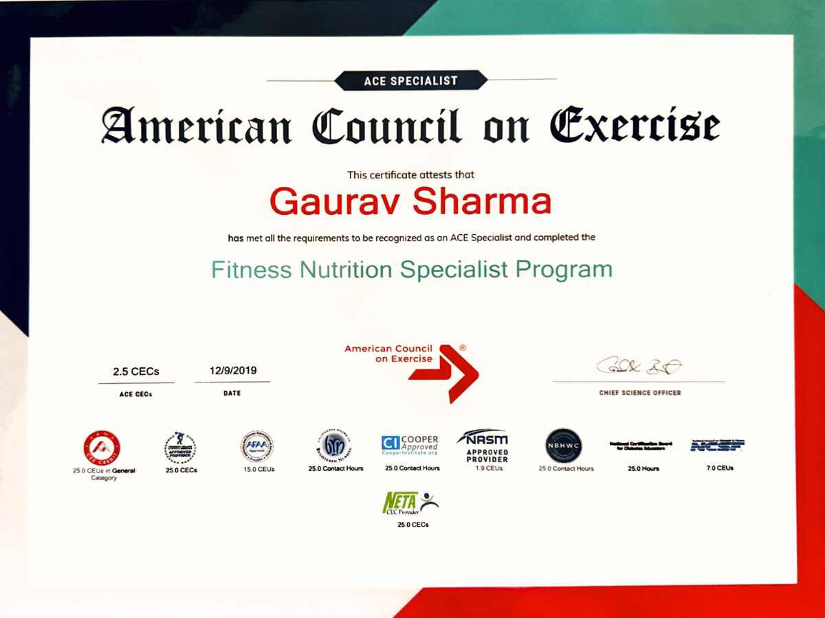 Fitness Nutrition Specialist (FNS) from American Council on Exercise (ACE) – The FNS certification bridges the gap between fitness and nutrition with science-based dietary strategies