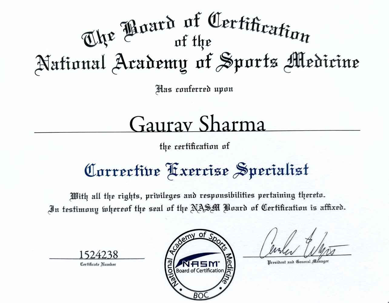 Corrective Exercise Specialist (CES) from National Academy of Sports Medicine (NASM) – One of the best certification that focuses on identifying and correcting muscle imbalances, movement dysfunctions, and postural issues