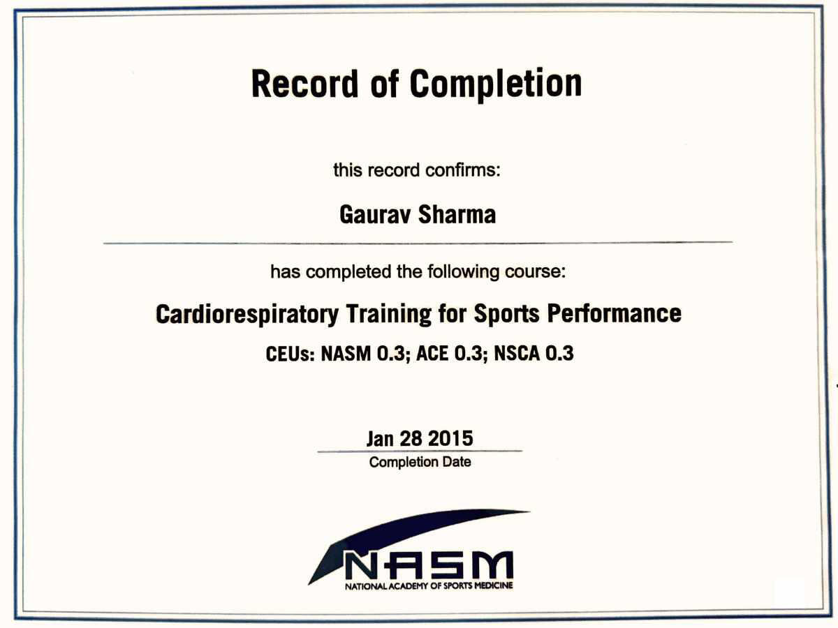 Certified in Cardiorespiratory Training for Sports Performance from National Academy of Sports Medicine (NASM) – This specialized course is for cardiorespiratory training for sports performance to boost endurance, stamina, and athletic performance
